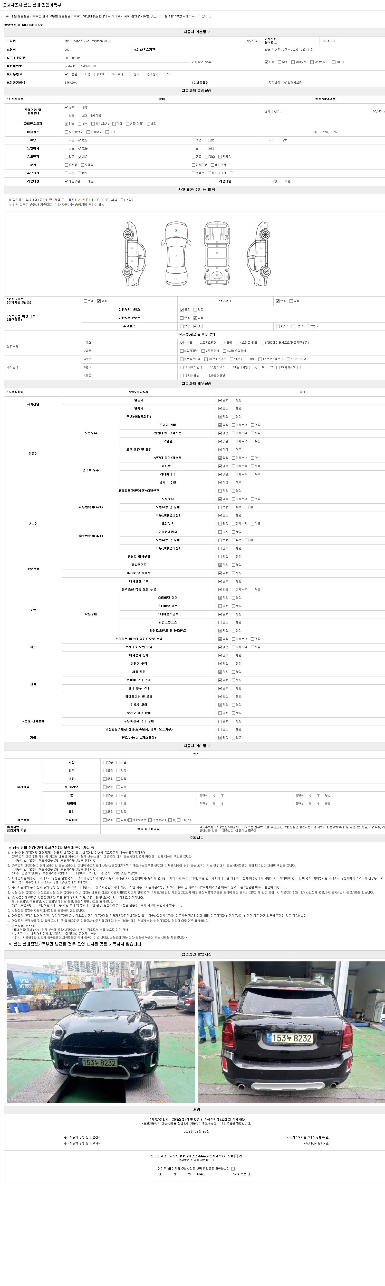 | 주행거리 | 63,448 km | 차량번호 | 153누8232 | 사고유무 | 성능기록부 참조 | 제시번호 | 제 2026010266 호 |