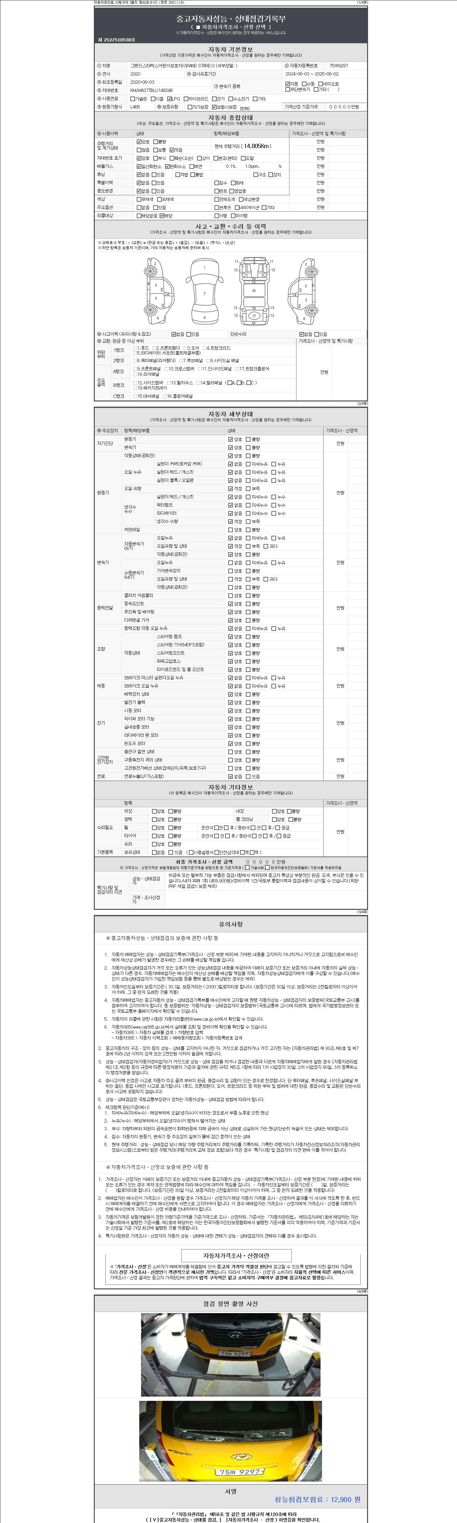 자동차관리법 시행규칙 제120조의 규정에 따라 별지 제 82호서식 《중고자동차 성능, 상태점검 기록부》를 발행한 성능, 상태점검자 및 매매자는 아래의 보증기간 또는 보증거리 이내의 중고자동차, 성능점검 기록부에 기재된 내용과 자동차의 실제 성능, 상태가 다른 경우 계약 또는 관계법령에 따라 매수인에 대하여 책임을 집니다.