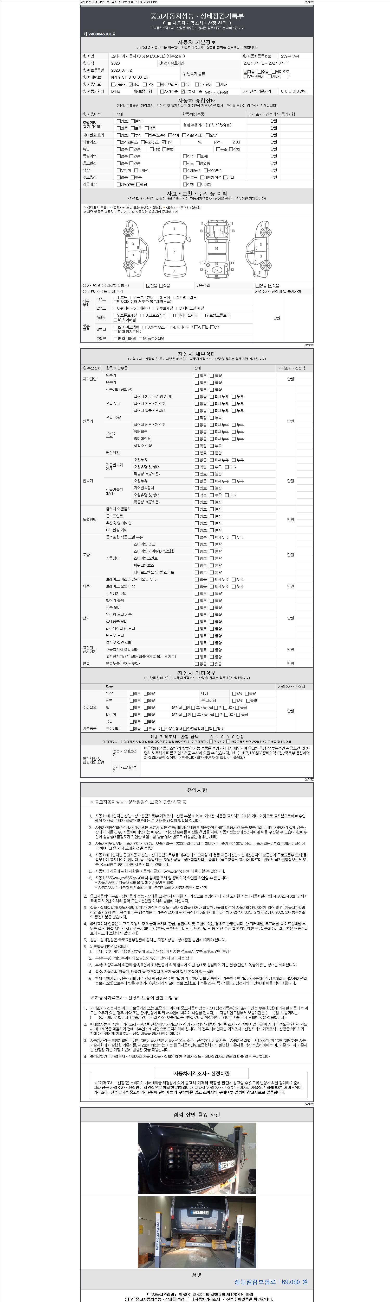 자동차관리법 시행규칙 제120조의 규정에 따라 별지 제 82호서식 《중고자동차 성능, 상태점검 기록부》를 발행한 성능, 상태점검자 및 매매자는 아래의 보증기간 또는 보증거리 이내의 중고자동차, 성능점검 기록부에 기재된 내용과 자동차의 실제 성능, 상태가 다른 경우 계약 또는 관계법령에 따라 매수인에 대하여 책임을 집니다.