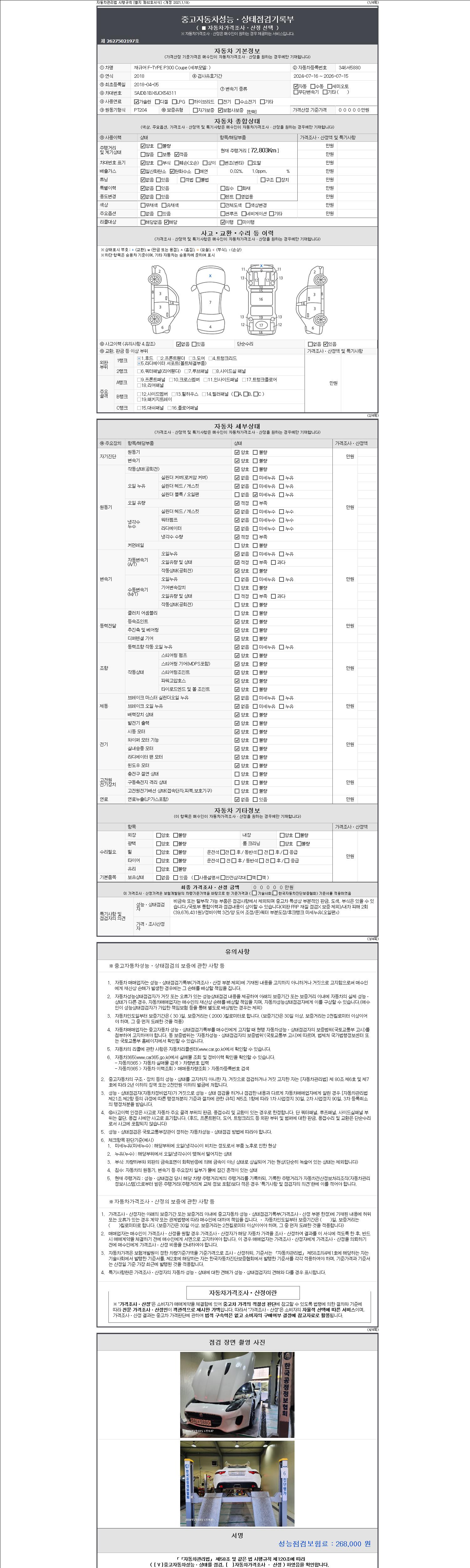 | 주행거리 | 72,805 km | 차량번호 | 346서5880 | 사고유무 | 성능기록부 참조 | 제시번호 | 제 2147483647 호 |