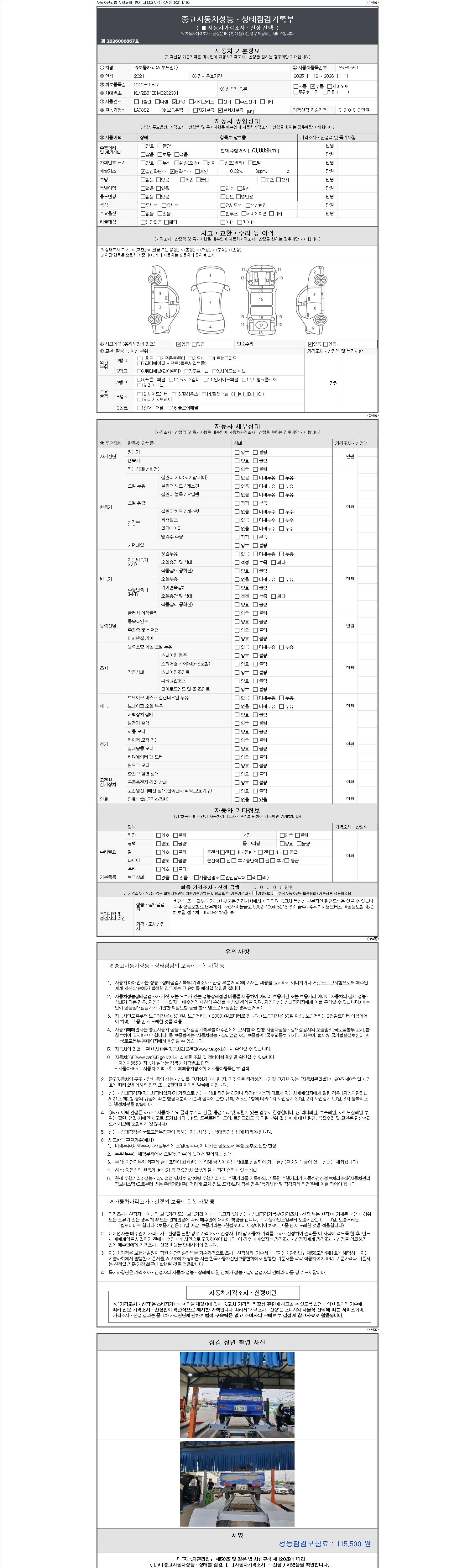 | 주행거리 | 73,090 km | 차량번호 | 85모0550 | 사고유무 | 성능기록부 참조 | 제시번호 | 제 2147483647 호 |