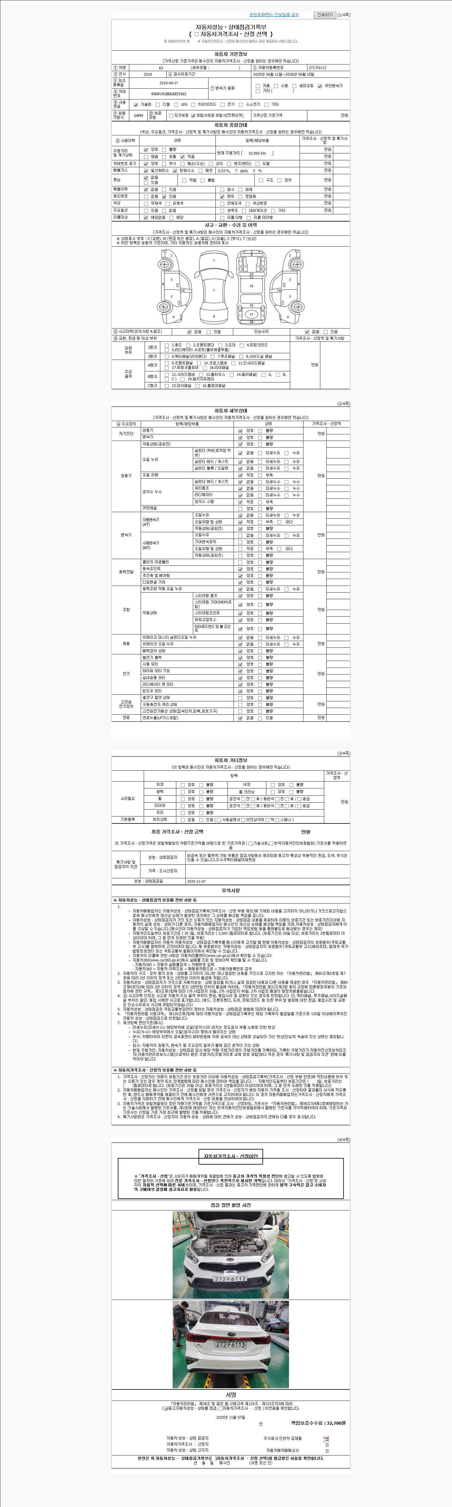 | 주행거리 | 52,992 km | 차량번호 | 272구6113 | 사고유무 | 성능기록부 참조 | 제시번호 | 제 2025061812 호 |
