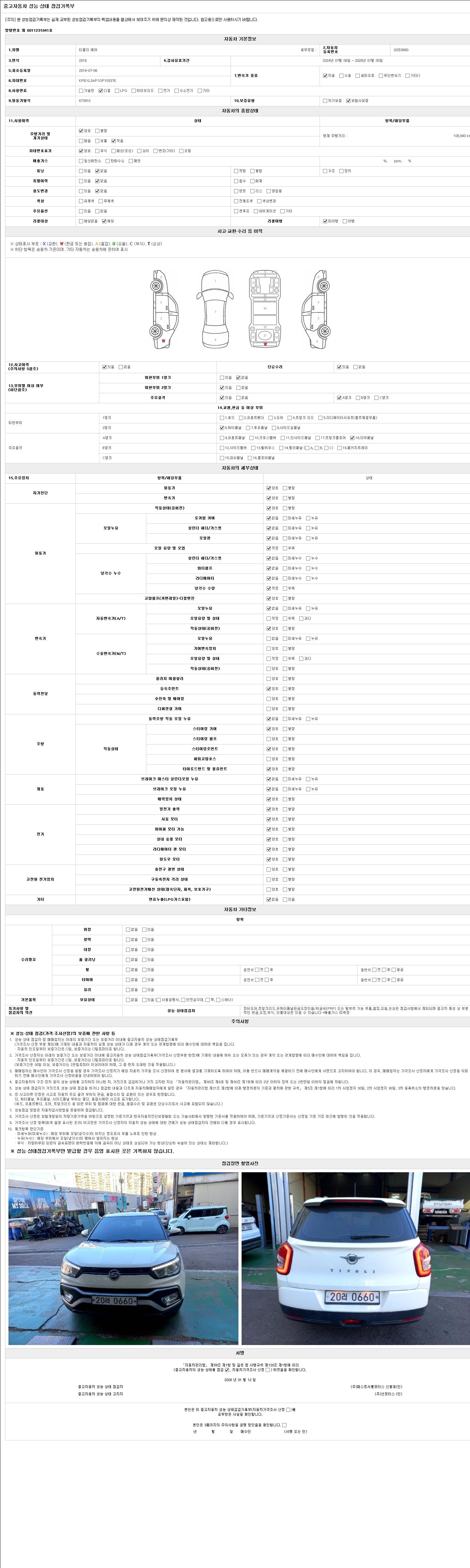 | 주행거리 | 108,940 km | 차량번호 | 20러0660 | 사고유무 | 성능기록부 참조 | 제시번호 | 제 2026001461 호 |