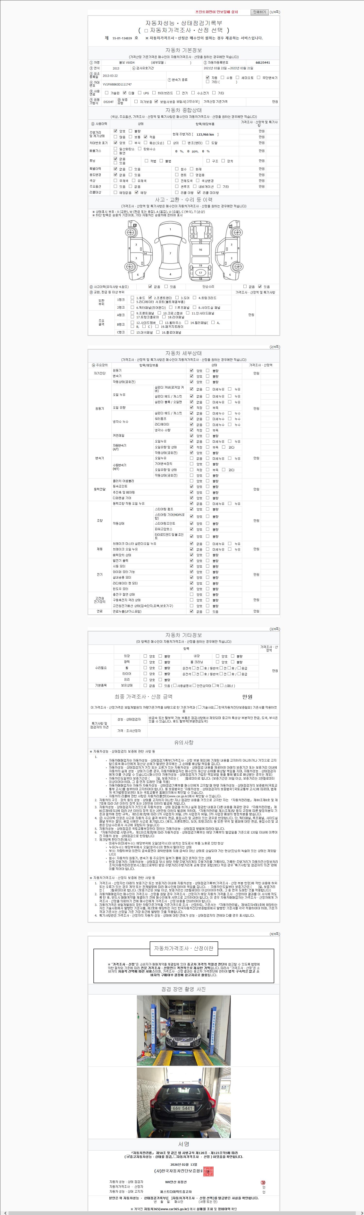 | 주행거리 | 123,966 km | 차량번호 | 66나5441 | 사고유무 | 성능기록부 참조 | 제시번호 | 제 2147483647 호 |