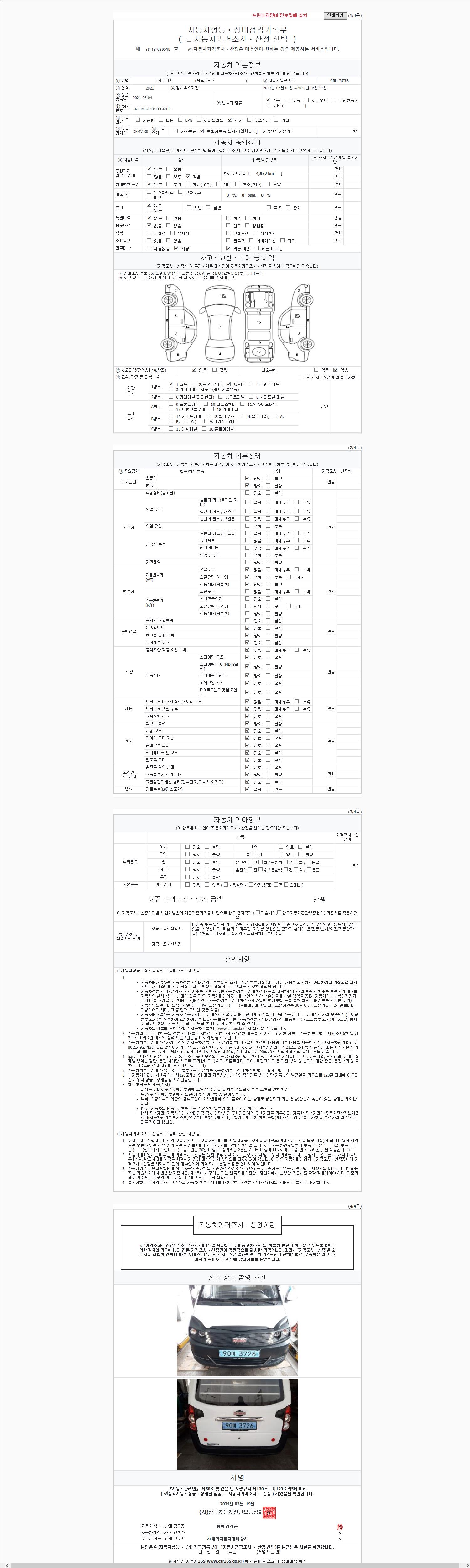| 주행거리 | 4,872 km | 차량번호 | 90마3726 | 사고유무 | 성능기록부 참조 | 제시번호 | 제 2147483647 호 |