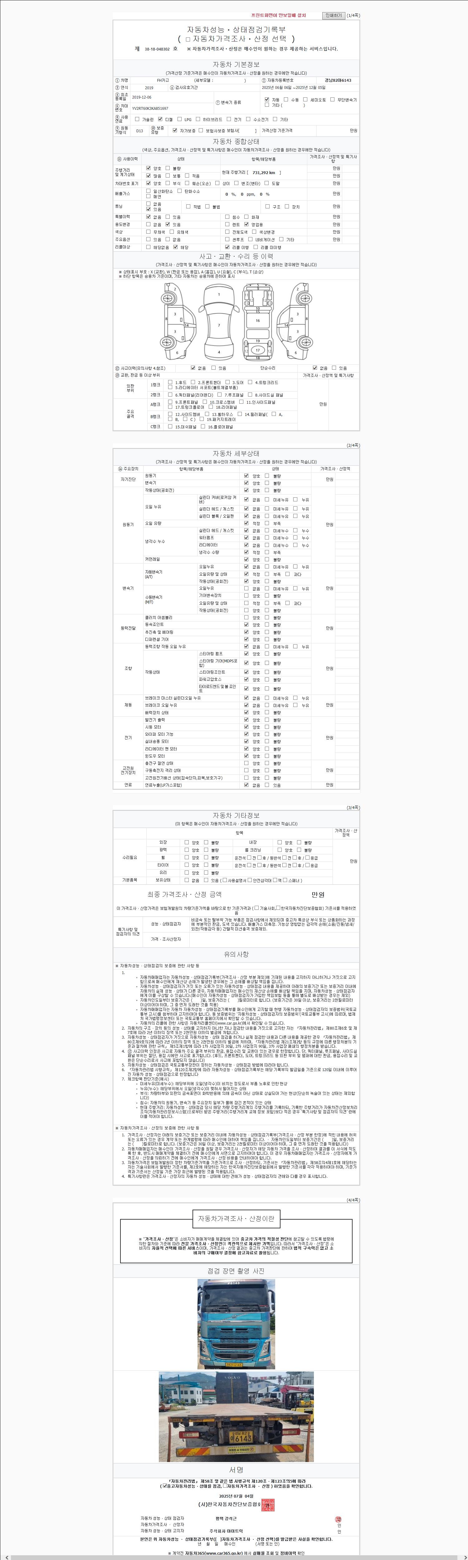 | 주행거리 | 731,292 km | 차량번호 | 86노8200 | 사고유무 | 성능기록부 참조 | 제시번호 | 제 2147483647 호 |