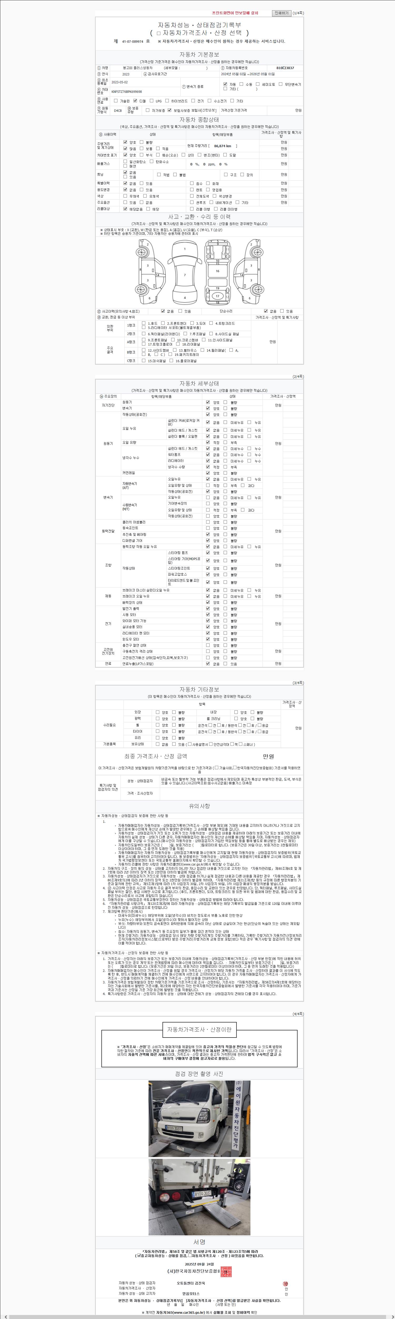 | 주행거리 | 86,874 km | 차량번호 | 810다3037 | 사고유무 | 성능기록부 참조 | 제시번호 | 제 2147483647 호 |