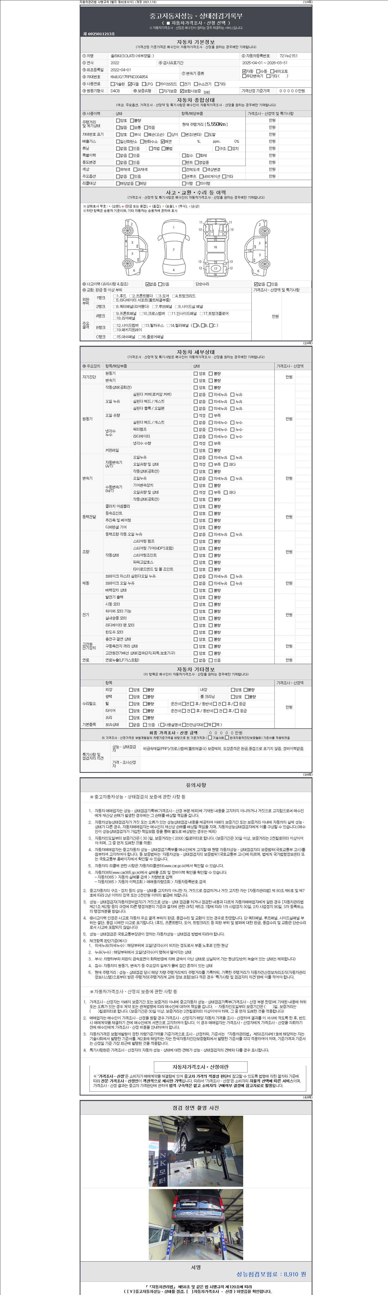 -중고자동차 매매업자를 통해 차량을 구입하실 경우 반드시 "중고자동차 성능, 상태점검 기록부"를 교뷰 받으셔야 하며, 매매업자는 반드시 의무 교부 하여야 압니다.