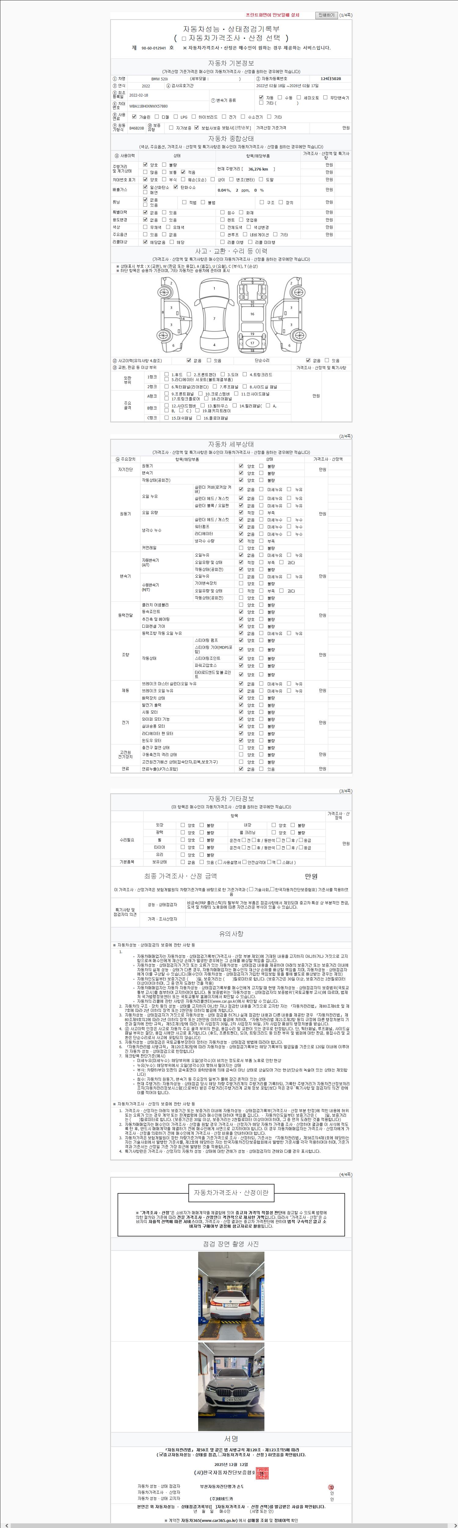 | 주행거리 | 36,275 km | 차량번호 | 124더5028 | 사고유무 | 성능기록부 참조 | 제시번호 | 제 2025230497 호 |