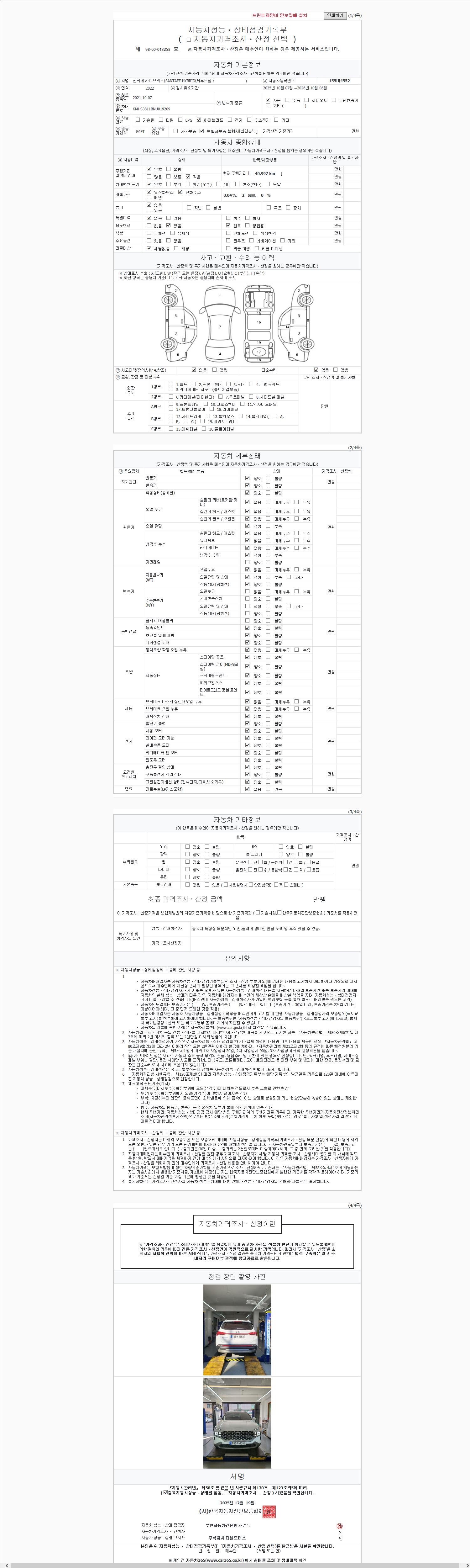 | 주행거리 | 40,000 km | 차량번호 | 155마4552 | 사고유무 | 성능기록부 참조 | 제시번호 | 제 2025240684 호 |