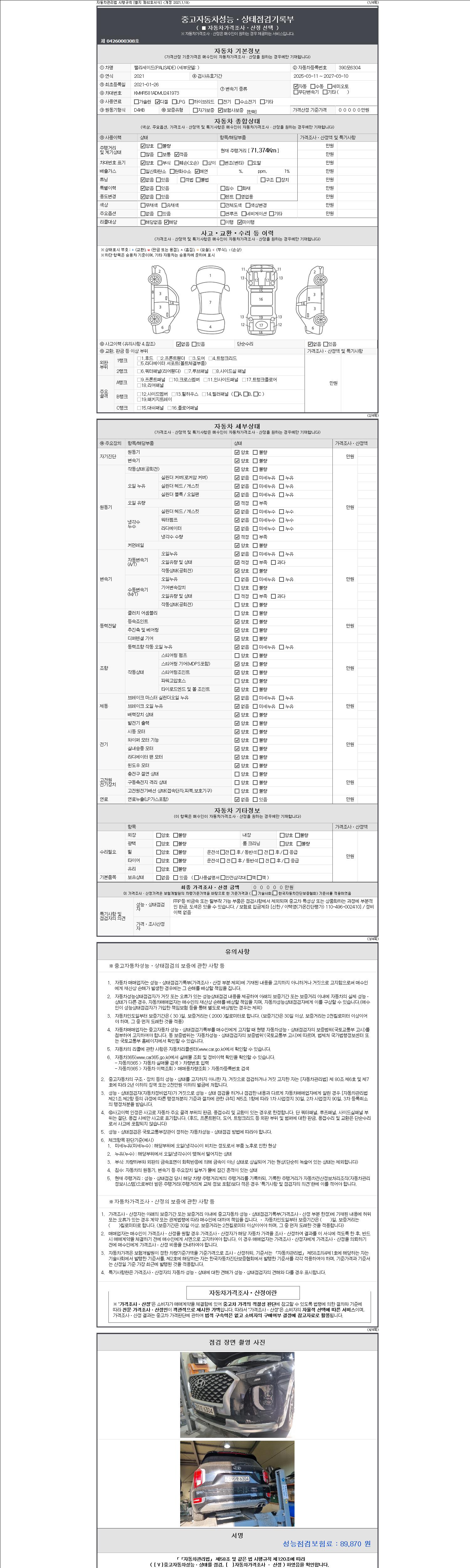 | 주행거리 | 71,374 km | 차량번호 | 390모6304 | 사고유무 | 성능기록부 참조 | 제시번호 | 제 2147483647 호 |