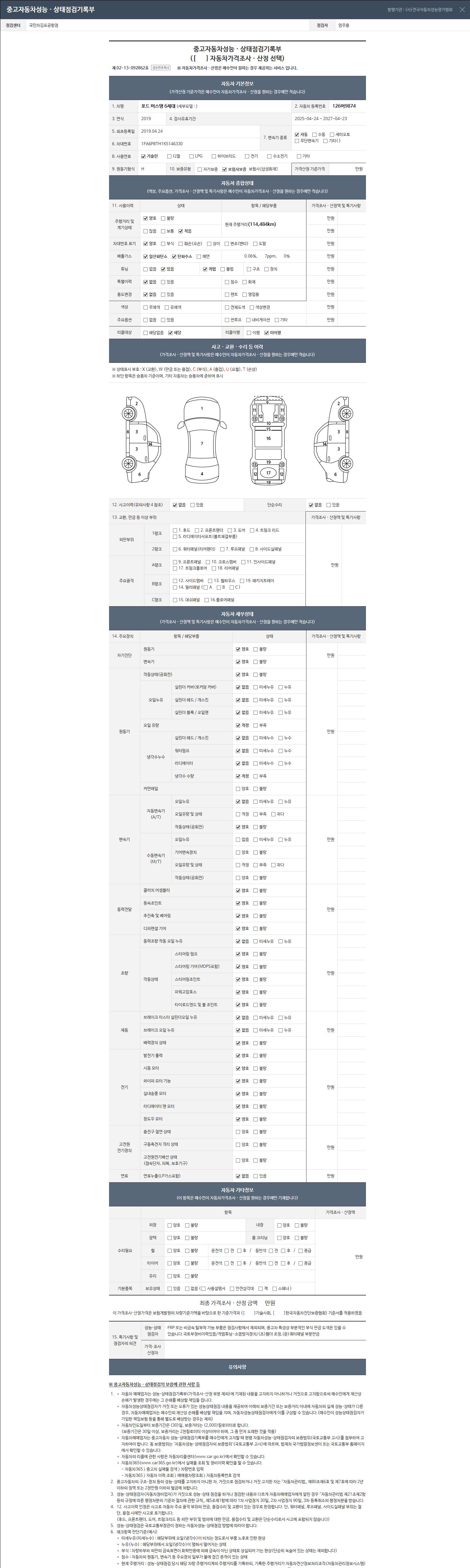| 주행거리 | 114,000 km | 차량번호 | 126머9874 | 사고유무 | 성능기록부 참조 | 제시번호 | 제 2026042291 호 |