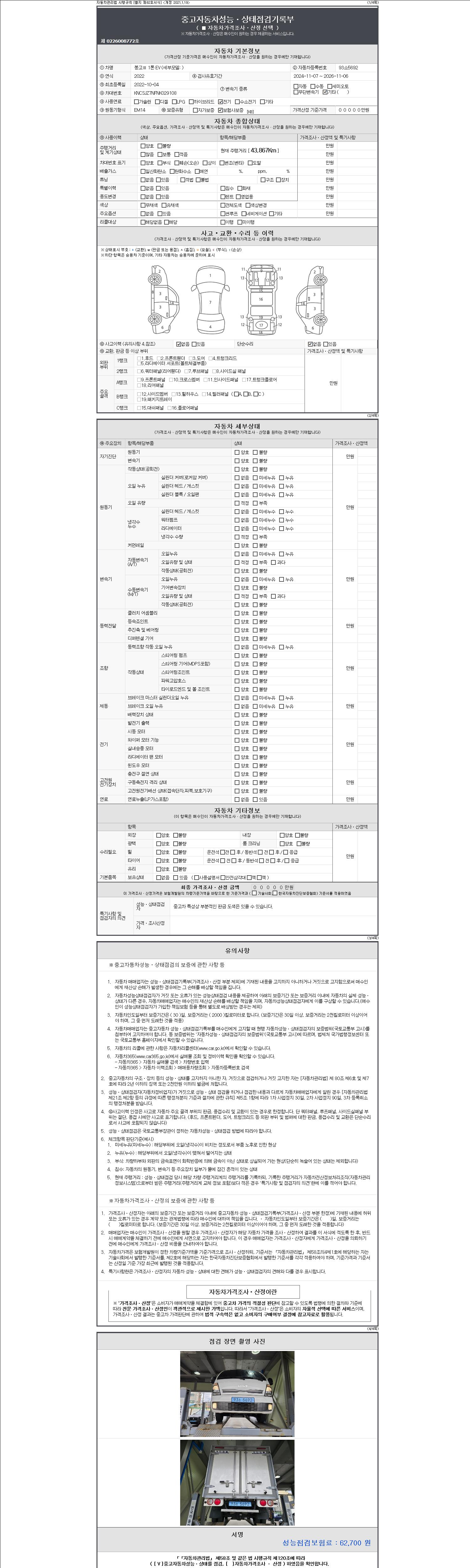 | 주행거리 | 43,867 km | 차량번호 | 93소5692 | 사고유무 | 성능기록부 참조 | 제시번호 | 제 2147483647 호 |