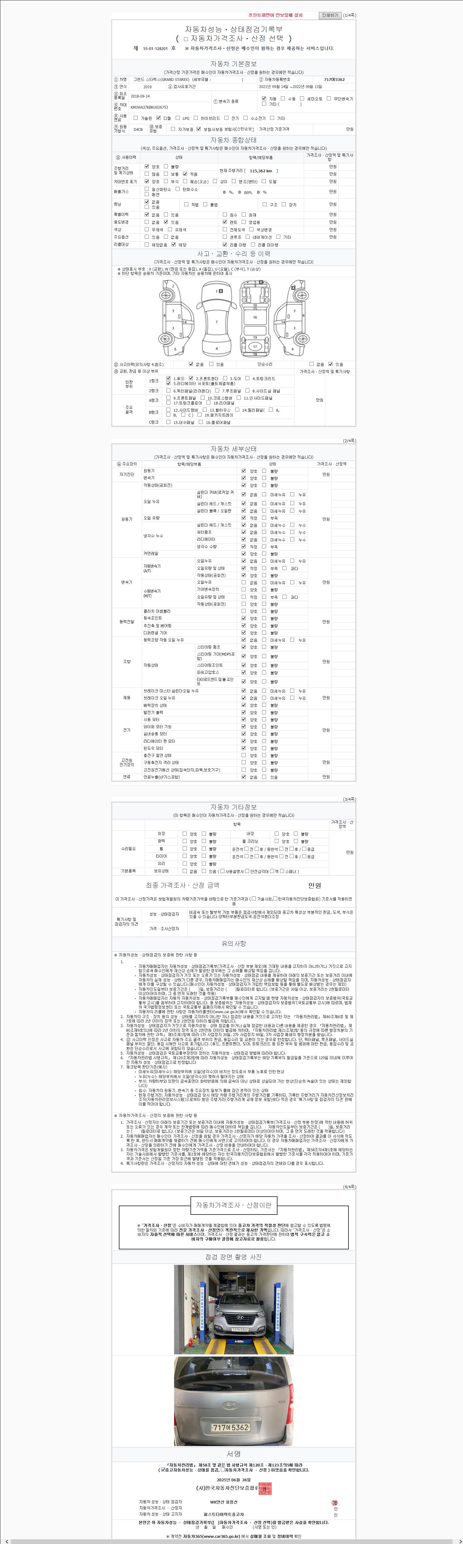 | 주행거리 | 115,362 km | 차량번호 | 717어5362 | 사고유무 | 성능기록부 참조 | 제시번호 | 제 2147483647 호 |