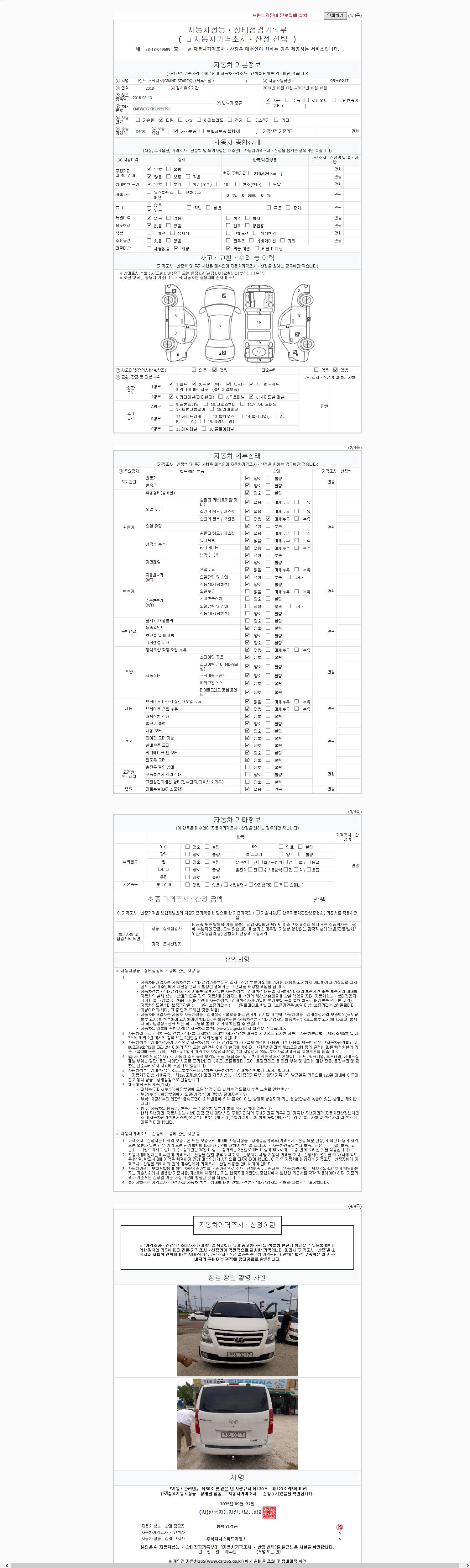 | 주행거리 | 210,624 km | 차량번호 | 95노0217 | 사고유무 | 성능기록부 참조 | 제시번호 | 제 2147483647 호 |