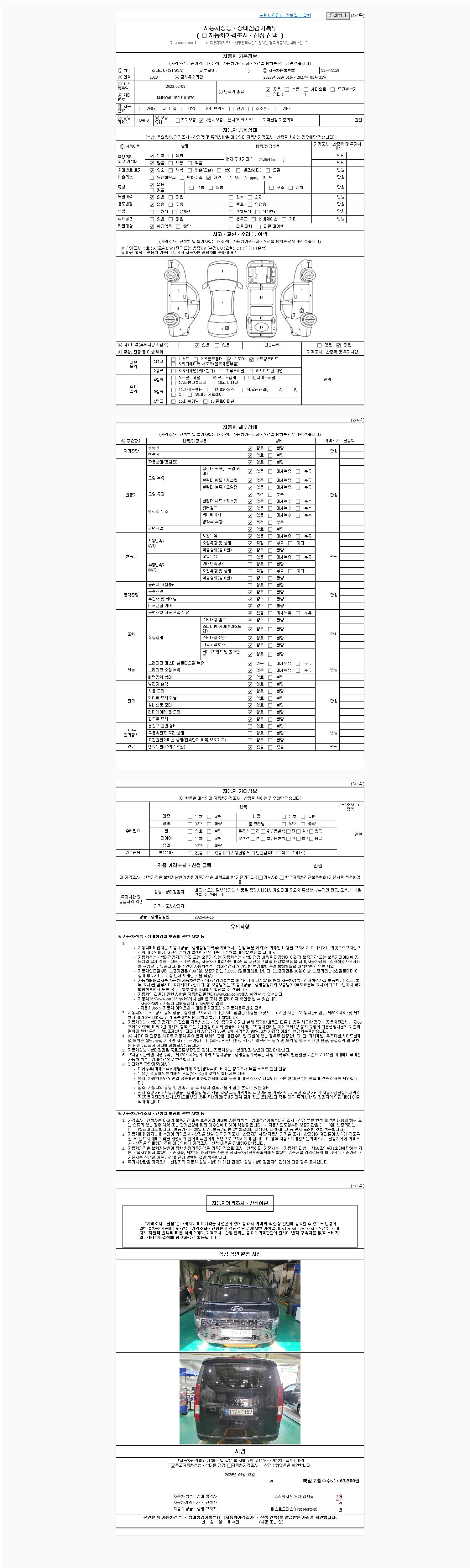 | 주행거리 | 74,039 km | 차량번호 | 117누1159 | 사고유무 | 성능기록부 참조 | 제시번호 | 제 2026019627 호 |