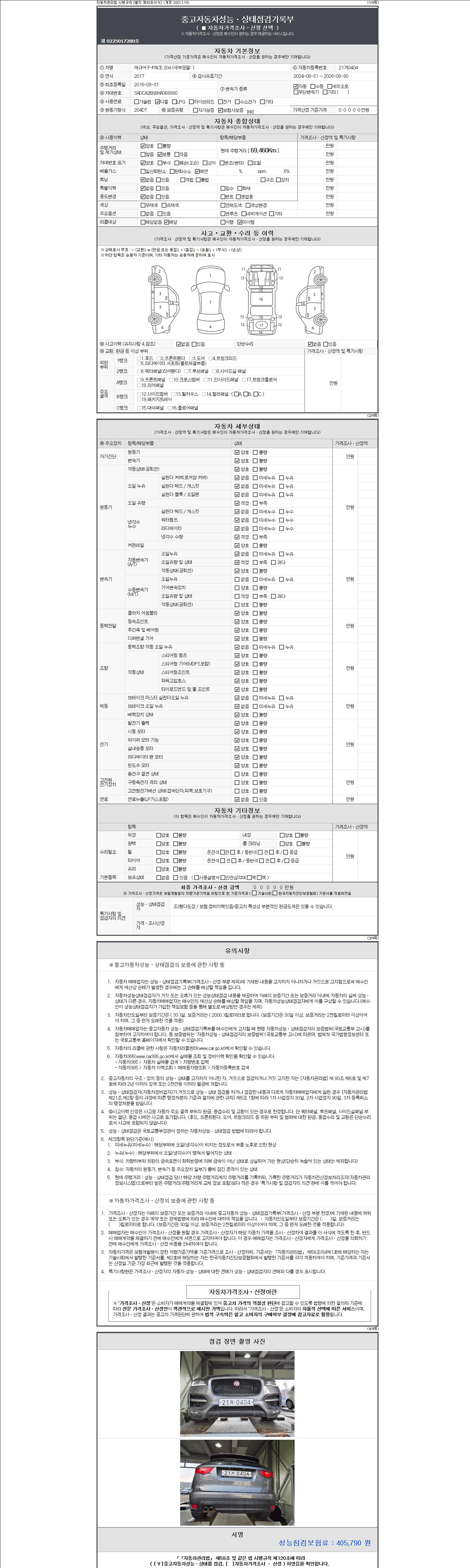 | 주행거리 | 69,000 km | 차량번호 | 21거0404 | 사고유무 | 성능기록부 참조 | 제시번호 | 제 2147483647 호 |