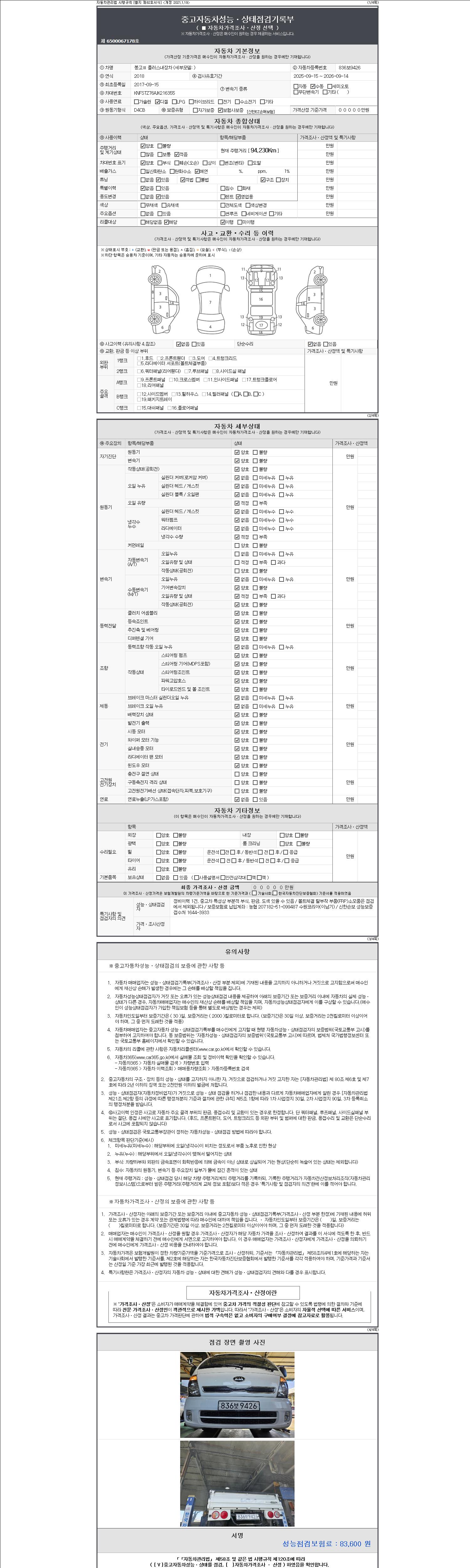 | 주행거리 | 94,225 km | 차량번호 | 836보9426 | 사고유무 | 성능기록부 참조 | 제시번호 | 제 2147483647 호 |